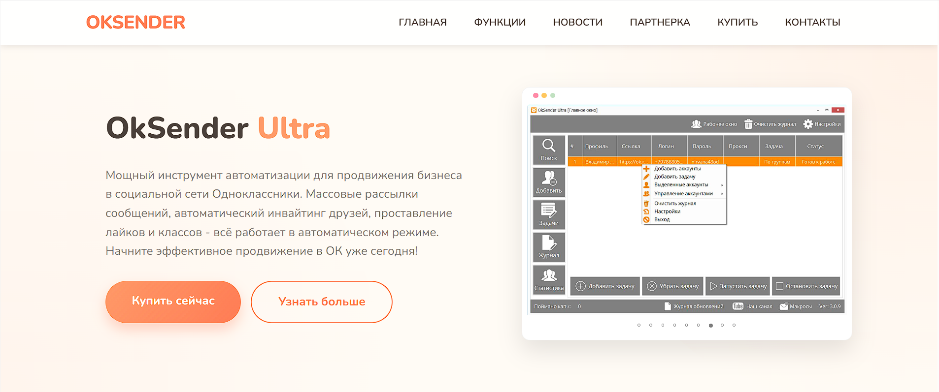 Мощный инструмент автоматизации для продвижения бизнеса в социальной сети Одноклассники. Массовые рассылки сообщений, автоматический инвайтинг друзей, проставление лайков и классов - всё работает в автоматическом режиме. Начните эффективное продвижение в ОК уже сегодня!