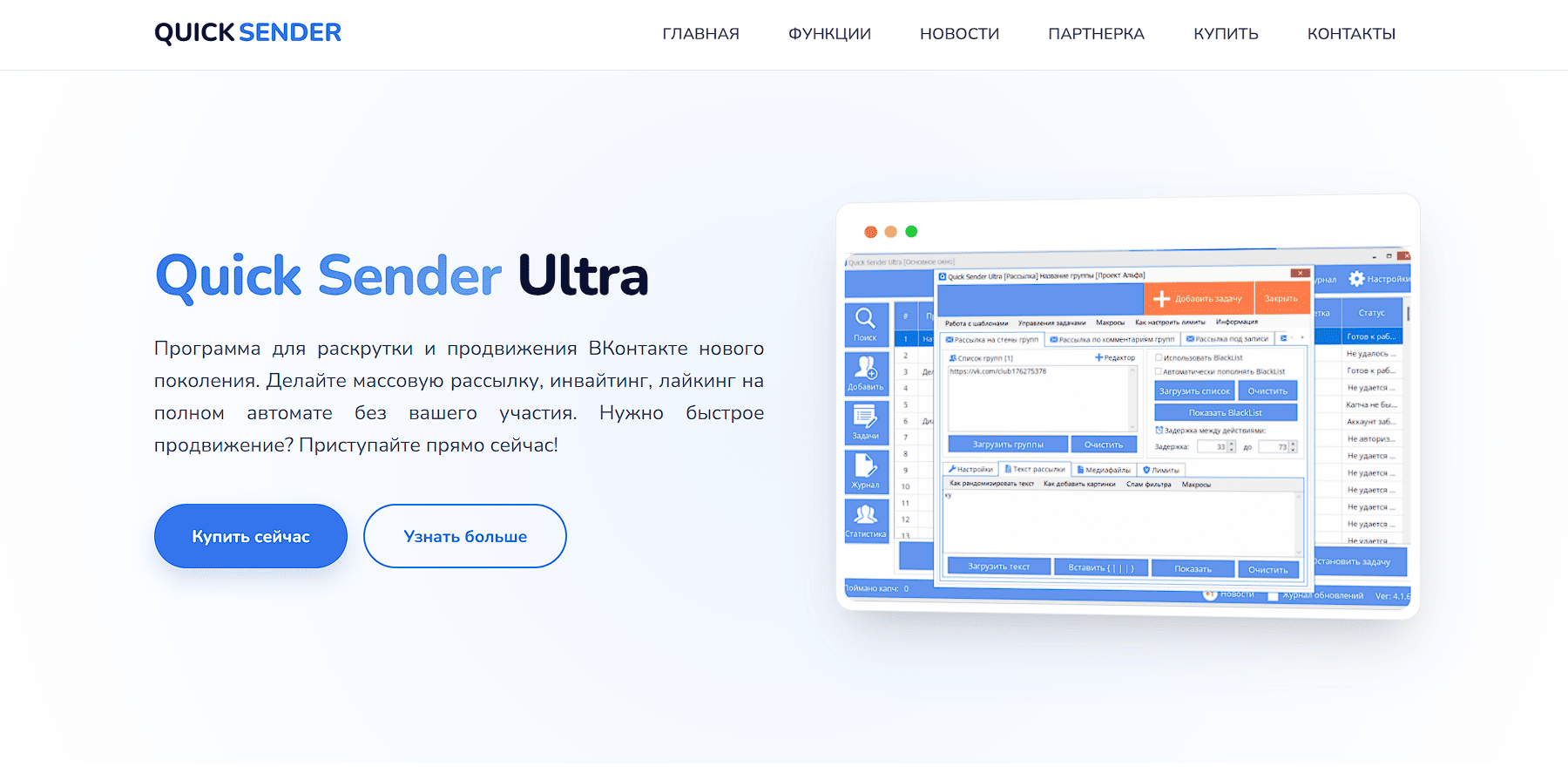 Программа для раскрутки и продвижения ВКонтакте нового поколения. Делайте массовую рассылку, инвайтинг, лайкинг на полном автомате без вашего участия. Нужно быстрое продвижение? Приступайте прямо сейчас!